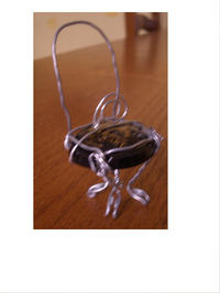 Cette oeuvre est une chaise munie d'un porte photo,elle a été réalisée avec le sertissage des bouchons de champagne (la partie en fer).Elle m'a été inspirée de petite chaise en file de fer vue je ne sais où, un peu refaite à ma façon et ajouté d'un porte photo. Je l'ai baptisé "PORTE PHOTO"
